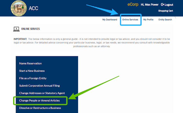 In order to change your LLC name, you must file the Articles of Amendment with the Arizona Corporation Commission. This officially updates your legal entity (your Limited Liability Company) on the state records.