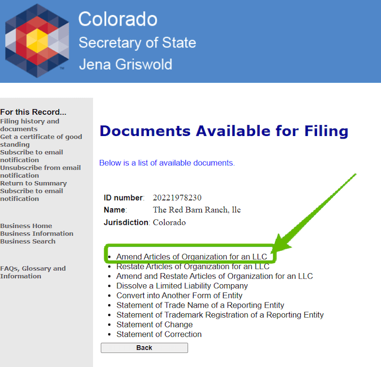 To Amend the Articles of Organization for your Colorado LLC, first go to the Business Entity Search.