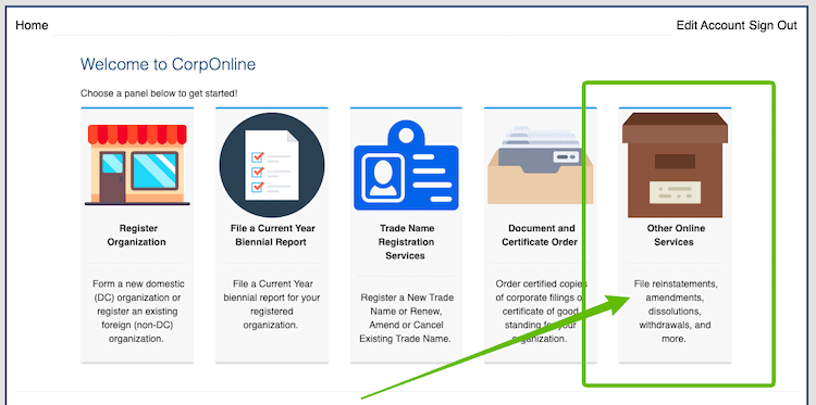 First, go to the CorpOnline website. Login with your AccessDC credentials, or create an account if you don’t have one.