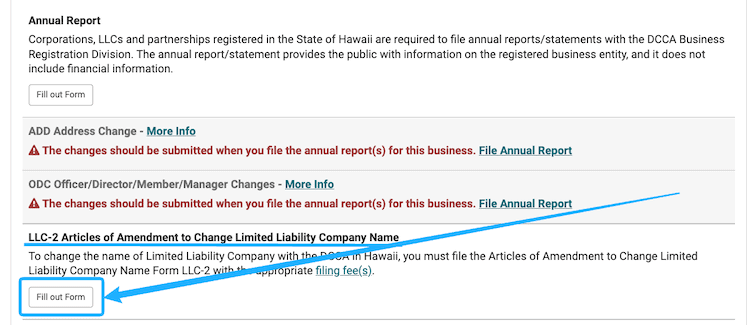 Note: The Articles of Amendment form instructions we provide below only describe how to change the name of your Hawaii LLC. If you want to make other changes, like the business address, mailing address, or registered agent, you’ll need to use different forms.