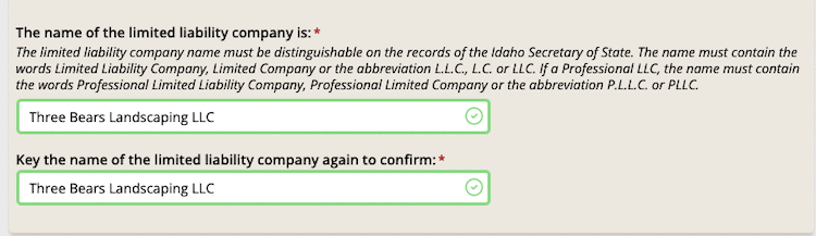 If the name is not available for use in Idaho, the box will turn red with an X next to the name. In that case, you’ll need to enter a different name and try again.