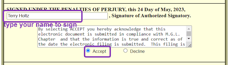 Type your name in the box to electronically sign the filing.