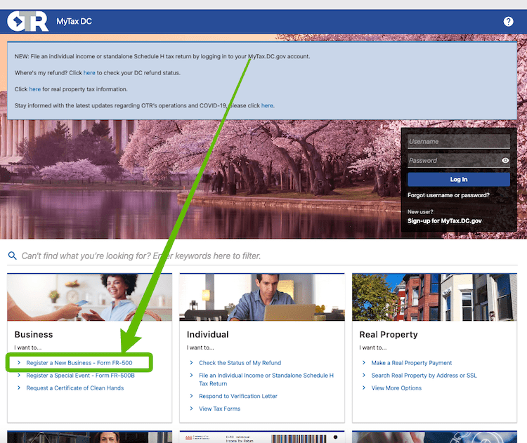 Get started: Go to the MyTax homepage and click “Register a New Business: Form FR-500” (it’s in the middle of the page).