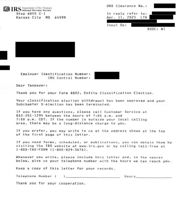 This tells the IRS to stop taxing your LLC like an S-Corporation. The IRS will then make a note in your LLC’s file that they should not look for an 1120S filing and they’ll place your LLC back into its default tax classification.