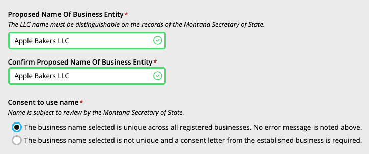 After you enter the name in both fields, the system will do a quick check to see if your LLC name is available. If it is available, the fields will have a green border and green checkmark logo: